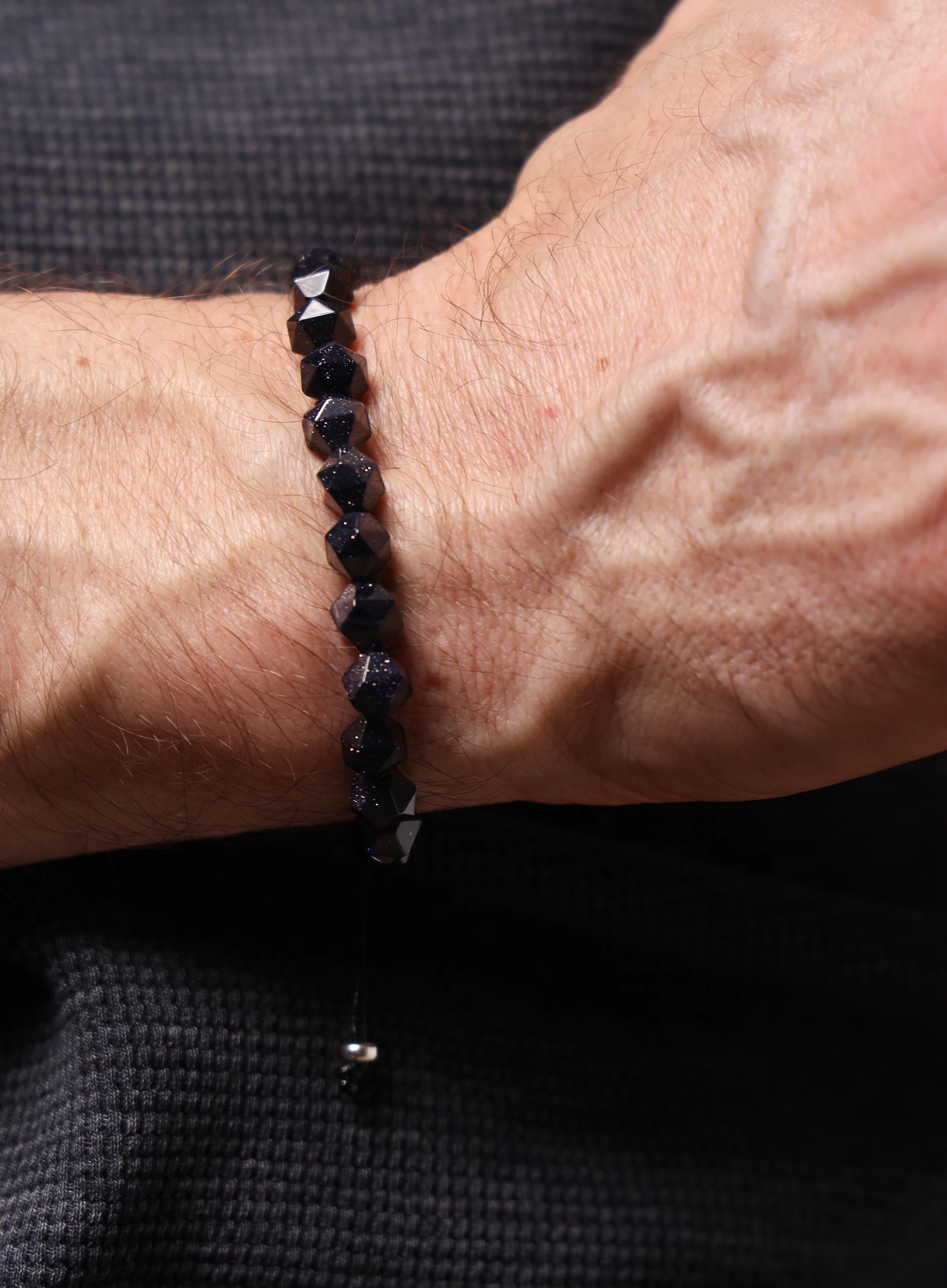 Blue Goldstone and Sterling Silver Men's Bead Bracelet - Dark Navy Blue Genuine Sunstone Gemstone Jewelry Gifts for Men