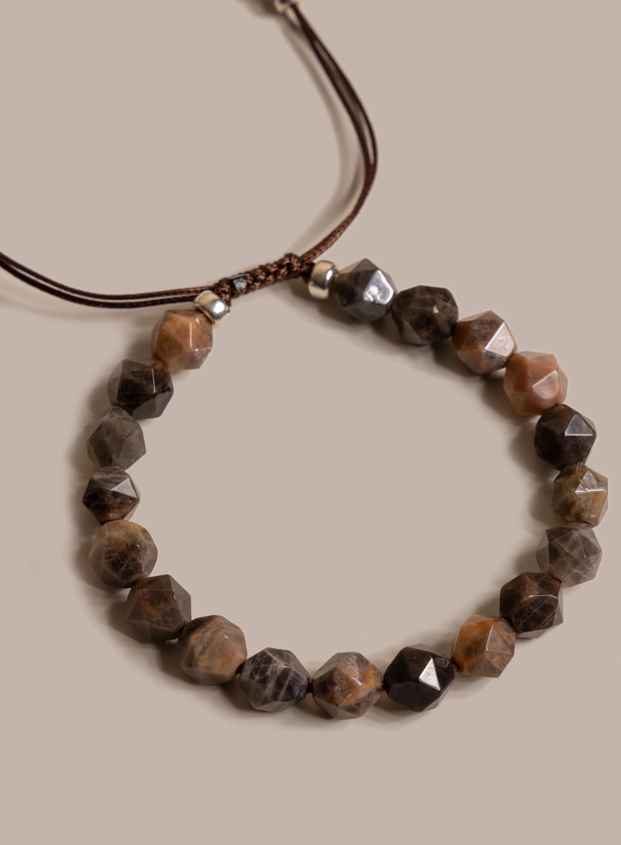 Chocolate Sunstone and Sterling Silver Men's Bead Bracelet - Brown Genuine Sunstone Geometric Gemstone Bracelet for Guys