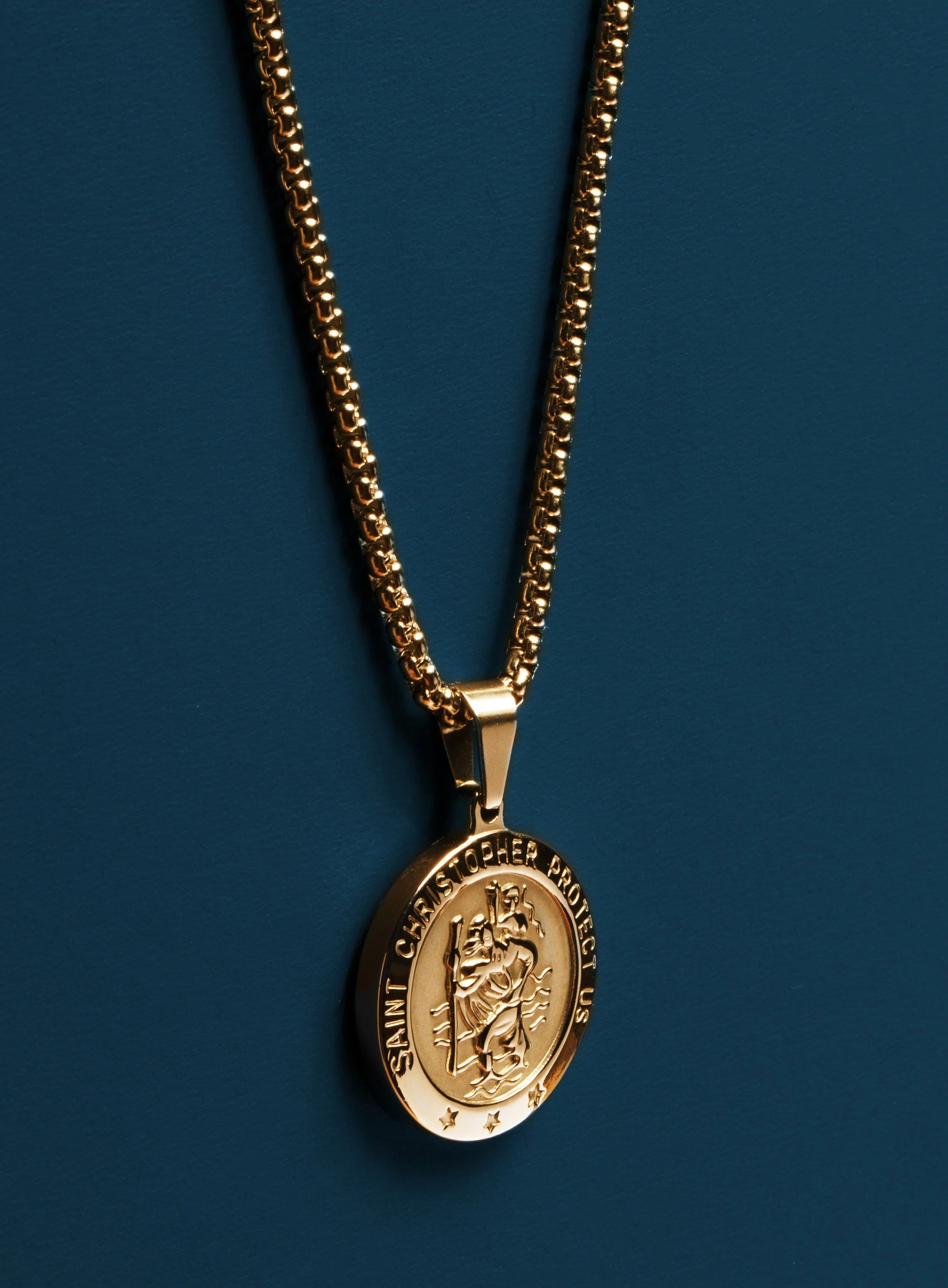 14k gold plated saint Christopher medal on round box chain